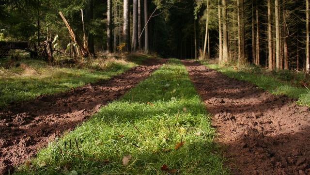 "Ein breiter Weg führt in den Wald. Hier haben Forstmaschinen im aufgewühlten Erdreich schlammige Spuren hinterlassen."