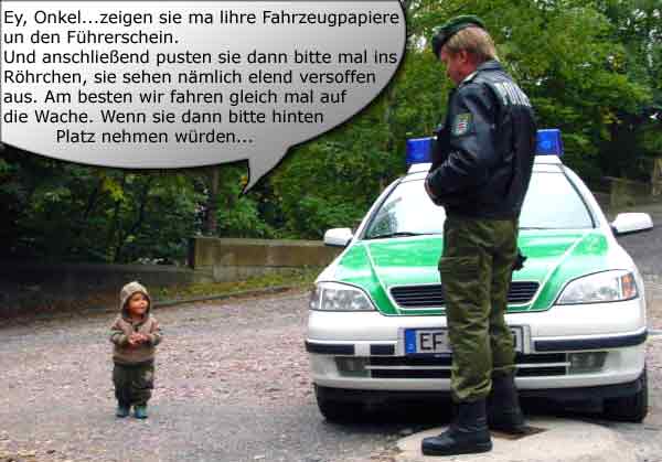 Ey, Onkel...zeigen sie ma lihre Fahrzeugpapiere un den Führerschein. Und anschließend pusten sie dann bitte mal ins Röhrchen, sie sehen nämlich elend versoffen aus. Am besten wir fahren gleich mal auf die Wache. Wenn sie dann bitte hinten Platz nehmen würden...%hrhr%