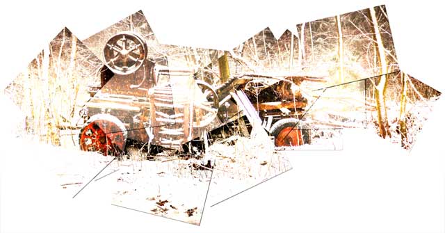 Es zeigt eine - wahrscheinlich - Kartoffellese-Maschine, die da versteckt im Wald stand. Gleichzeitig schneite es aus allen Himmelstoren und sah ganz so aus, als wäre der Winter zurückgekehrt .