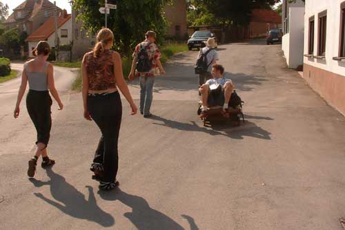 ".. durch Neunhofen. Artack, der unter Extremusfaul-Krankheit litt mußte sich neben dem Grill und ein paar alten Wiskey-Flaschen auf unserem Böllerwagen Platz schaffen."