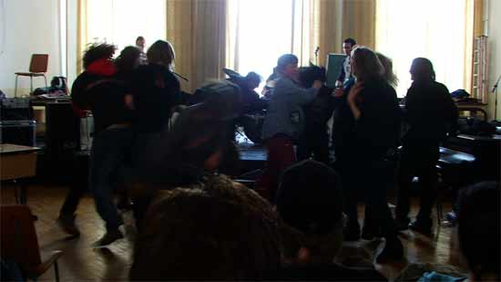 Für Außenstehende: Ein paar 8 Klässler groovten wie die Kaputten im Takt ihrer Band. Als es etwas heftig wurde mußten Lehrer eingreifen. Dann war aber wieder alles okey."