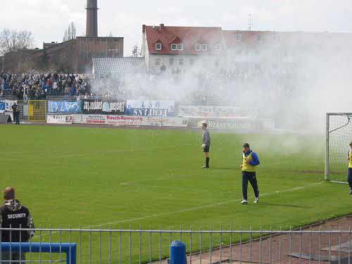 "...spitzte sich die Lage zu. Magdeburger Fans haben nach dem 2:0 für ihren Klub ein wenig Rauch gemacht. Zu diesem Zeitpunkt machte sich im Jenaer Block etwas Unruhe breit und die Bullen zogen sicherheitshalber mal die Helme auf..."