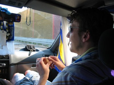 "...waren wir schon mit dem Panzer unterwegs, als ein allgemeines Hungergefühl bei den Passagieren einsetzte. Ich hab 2 Bananen gefuttert und Ulle hat sich, wie sich das für Sonntag gehört, erstmal ein Frühstücksei und ne Stulle reingepfiffen.  Was die Passagiere auf der Rückbank gegessen haben, weiß ich nicht...musste mich ja auf die Straße konzentrieren... "