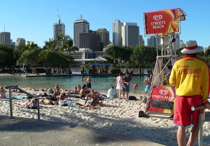 "...in South Bank. "Streets" ist die australische Ausgabe von Langnese. Der Strand ist künstlich, das Wasser riecht nach Chlor - soviel zur Natürlichkeit. Aber ein Anziehungspunkt ist es allemal. Und man hat Blick auf die Hochhäuser auf der anderen Seite des Flusses . Und es gibt sogar Rettungsschwimmer für das sehr flache Wasser "
