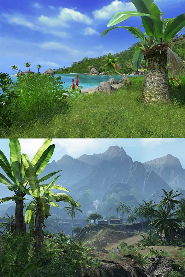 "Auch der Vorgänger (oben) bestach schon durch auffallend detailgetreue Optik. Im Nachfolger (unten) findet man nun durchscheinende Palmenblätter, omnipräsenten Schatten und riesige Welten vor."