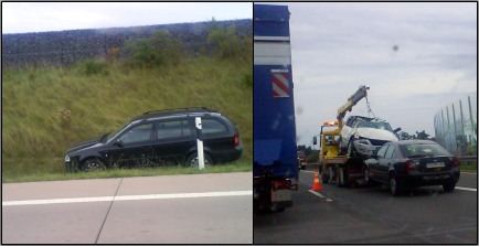 Ein dunkelroter Golf - geplatzte Hinterreifen ... dass konnte es nicht gewesen sein. Immer noch zügelte der Verkehr mit Schrittgeschwindigkeit einher. Dann Spuren durchs Gras an der Seite etwa 20 Meter den Berg hinauf!? (WTF!?). Drei Herzschläge später ein Auto neben der Fahrbahn im Straßengraben festgefahren.