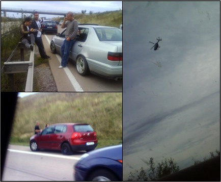 Stillstand - und keiner wusste warum. Nach 5 Minuten krackselten die ersten Menschen - entgegen aller Verbote - aus ihren Karren.. Grimmig schauten sie in die Runde und sahen sich um ihr Wochenende betrogen. Die Dame in unserer MFG hatte sich auf die naheliegende Brücke begeben und war mit der Beurteilung zurück gekehrt, dass die Lage aussichtslos sei. Ein Hubschrauber kreiste in Wartestellung über dem ganzen Szenario, während sich meine Mitfahrer über die alten Schulzeiten in Erfurt an der Fachhochschule austauschten..