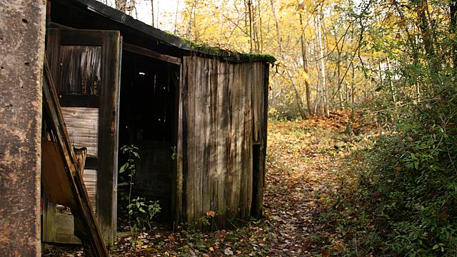 "Vorsichtig wird das Gebäude umlaufen. Es gibt kein Weg Richtung Straße. Das Interessse fällt auf diesen kleinen Schuppen, der im Gegensatz zum Rest des Gebäudes komplett aus Holz besteht."
