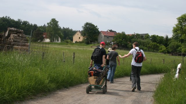 ".. ging's Kospoda entgegen. Der Auftrag für diese Zwischenetappe lautete: Böllerwagen dortlassen und Fußball mit > 10cm Durchmesser aufnehmen. (Wer ganz lange auf das Bild schaut der kann sehen, wie nachlässig Janosh dieses Jahr war - rechts unten steht noch ein Wegpfeiler)"