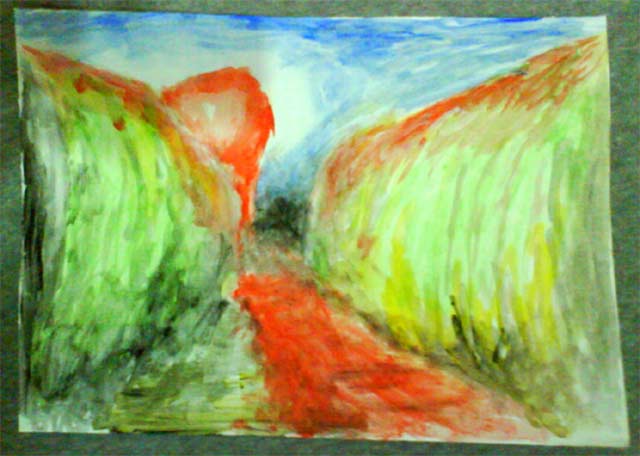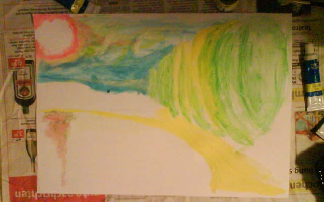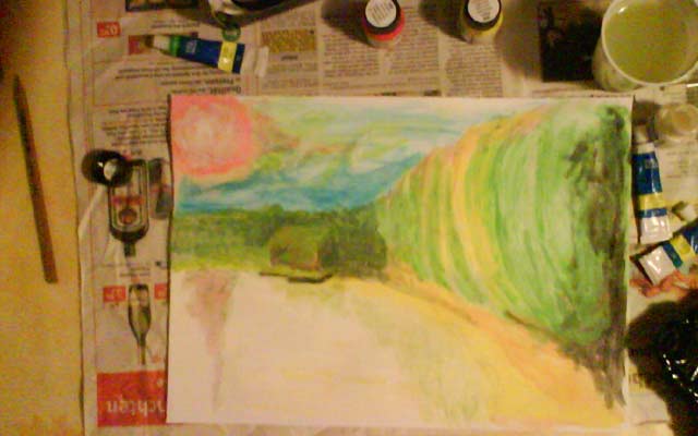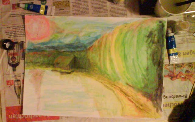 HochgeschwindigkeitsmalereiDieses professionelle Wort soll die kurze Entstehungszeit des Bildes untermauern. Was Van Gogh (Schludermalergenie wie ich) kann - mach ich mit links, dachte ich mir und speedete los. Eine rote Abendsonne, deren rot auf die Straße läuft.