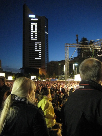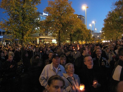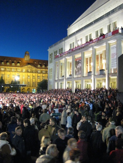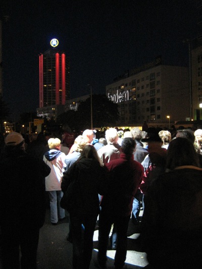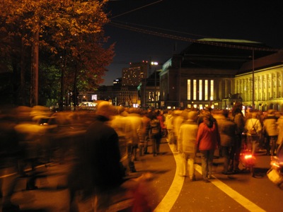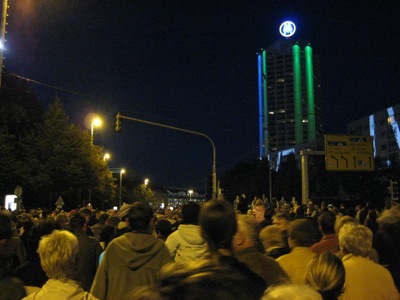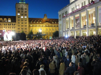 Es sind 100.000 menschen den historischen weg um den innenstadtring gelaufen, um an die montagsdemos vor 20 jahren zu erinnern. denn am 9.10.89 sind 70.000 leipziger unter todesangst um den ring gelaufen. mit rufen wie "schließt euch an" und "wir sind das volk" haben sie das regime in die knie gezwungen. und genau dessen wurde 20 jahre später gedacht. das ganze war mit viel licht initiiert und es war irgendwie bewegend da mittendrin zu sein. das beste inszenierung gab es 20 jahre später am bahnhof. an dieser stelle hatten die demonstranten vor 20 jahren am meisten angst vor der zerschlagung der demo durch die stasi und die handlanger der SED. 1989 wurde dort eine woche zuvor eine demonstration blutig niedergeschlagen. doch am 9.10.89 ließ die stasi die demo passieren. 70.000 leute in schach zu halten war zu riskant. jedenfalls hatten künstler 20 jahre später den bahnhof sehr krass illuminiert. auf der fassade war ein rauschen zu sehen. sehr konfus. nichts greifbares. die künstler argumentierten, dass sich hier erst der ausgang der demo abzeichnete. - ein bild quasi klar wurde. dieses rauschbild wurde mit einem ton untermauert. das war beängstigend. so ein dumpfes grollen und summen. das war der hammer. es war so laut, dass man in 200m um den bahnhof alles sehr gedämpft hörte. es war so, als wurden einem die ohren zu gehalten. man verstand zwar noch seinen nachbar und hörte auch alles, aber dieser dumpfe ton drückte in die magengegend und es war für mich sowas wie hörbare ohnmacht. sehr geil gemacht. genauso mussten sich die menschen vor 20 jahren gefühlt haben. also das lichterfest...ein toller akt für leipzig. und ein tolles zeichen für ein vereinigtes deutschland. einzig was mich wieder genervt hat, dass die berichterstattung im "west"fernsehen so eine veranstaltung nicht als interessant bewertet und darüber mal ausführlich berichtet. da sind berichte über naddels dummheit oder irgendwelche massaker wichtiger. Bildeindrücke