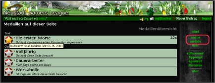 30.05.2010 - Die erste Medaille umgesetzt (die für dem ersten Kommentar bzw. die ersten Worte). Weiter schon geplant... - Medaillen werden nur für aktive Nutzer berechnet - daher sind aktuell nur 12 Medaillen vergeben -Benachrichtigungen sind nun schneller weg bzw. bleiben nachdem Anklicken nicht noch einen weiteren Seitenladezyklus stehen. - Menü auf der rechten Seite ausgemistet. Mir schwebt noch vor, Spiele über eine gemeinsame Startseite zusammen zu fassen. - MiniUpdate - Wer offene Sachen in Tippo-, Reflexomat oder 4-Gewinnt hat, der sieht oben ein Icon anderfalls nicht. Wer keine Symbole sieht hat alles erledigt.