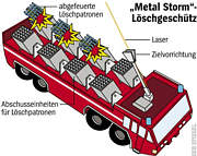 Eine der mörderischsten Waffen für die US-Armee ist gerade bei der australischen Firma Metal Storm in Arbeit: eine Art Maschinengewehr, das aus einer Unzahl von Rohren ganze Schwärme von Kugeln oder Granaten verschießt - theoretisch bis zu eine Million pro Minute. Die Projektile stecken hintereinander in den Läufen; abgefeuert werden sie per Computer, ein Laserstrahl lenkt sie ins Ziel. Nun will die Firma mit derselben Technik auch Löschkanonen für die Feuerwehr bauen. Ihre Artillerie könnte nämlich ebenso gut Kanister speien, die einen feuerdämmenden Stoff enthalten. Wenn etwa ein Hochhaus brennt, kommt man mit Löschwasser oft nicht schnell genug an den Brandherd heran. Ein Feuerwehrauto aber, das mit dem Löschgeschütz vorfährt, ballert einfach ein paar Salven in die betroffenen Etagen. Das drängt die Flammen so weit zurück, dass die Feuerwehrleute den Rest löschen können wie üblich: auf dem Weg durchs Treppenhaus empor.