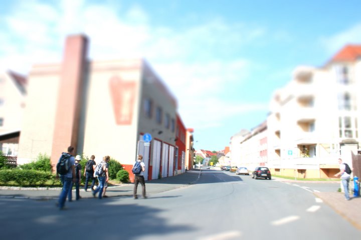 "mit Blick auf das Feuerwehrhaus (links)."