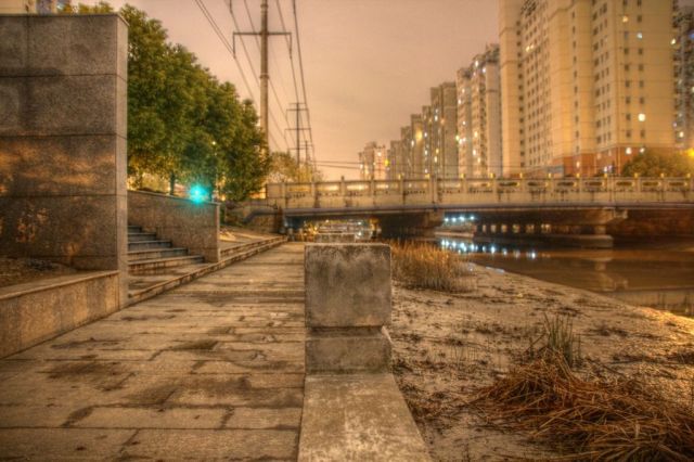 "Fluss in Shanghai mit niedrigem Wasserstand bei Nacht - endlich weniger Menschen