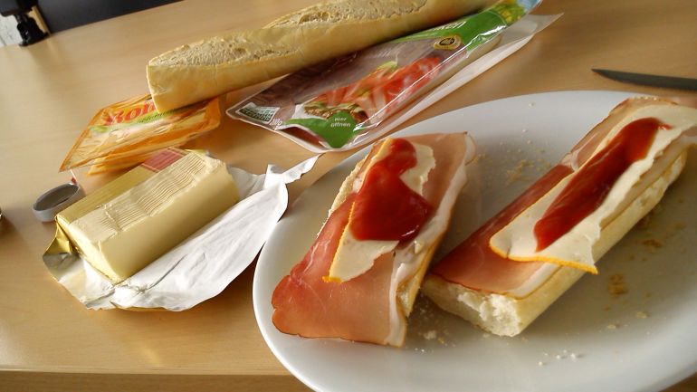 obwohl, es hat 5,60 gekostet (inkl. butter, ketchup, käse, schinken und baquette...). also doch eher ein dekadentes mahl....