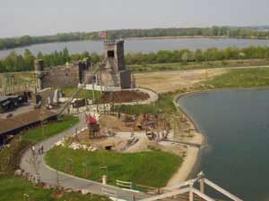 Schnell waren wir zu viert - ein Automobil also gefüllt. In aller herrgotts Frühe, nach der halsberecherichen 7,30 Vorlesung, stiegen wir also in den Wagen und ab ging's nach Leipzig. Das Wetter war fantastisch und Dank der immernoch fehlenden Autobahndirektverbindung Chemnitz-Leipzig konnten wir die malerische Landschaft Entlang der B95 bewundern. Die Beschilderung verwirrte etwas, fehlte sie doch meist ganz. Jedoch kein Problem für uns vier vergnügungssüchtige Studis. Um kurz vor 11 parkten wir ein und begannen wehement unseren Rabatt zu erstreiten. Dank einer netten Kassiererin und tollen Überredungskünsten des Initiators, waren wir kurze Zeit später drin. Der Termin war natürlich äußerst günstig, denn es tummelten sich nur ein paar Schulklassen. Und da für die heutige Jugend der "Kick" ja schnell vorüber ist, holen die sich ein kühles Helles und lassen uns den Vortritt. Sechs verschiedene Regionen kennzeichnen den Park (Insel der Ritter-England; Land der Grafen-Mittelnordeuropa; Küste der Entdecker-Spanien/Porugal; Strand der Götter-östliches Mittelmeer; Tal der Pharaonen-Ägypten; Schloss Belantis-Nordafrika) und wenn man mit dem Flugzeug drüber fliegen würde, so ergebe das ein topografisches Bild von Europa und Nordafrika. Idee ganz gut - leider die Umsetzung schlecht. Nach 3 Stunden hatten wir alles - und ich meine wirklich alles - erkundet. Vieles wirkt noch zu neu, zu oberflächig und zu sparsam. Die Detailtreue ist generell etwas vernachlässigt und man mag glauben, da wurde einfach schnell ein Low-Budget Park hingestellt um den Leuten das Geld aus der Tasche zu ziehen - mehr Spaß im Osten. Doch will ich die Sache nicht ganz schlecht reden. Ein Plus hat die Wildwasserrutsche und Ritterburg mit Achterbahn (leider ohne Looping) verdient. Aufgrund der niedrigen Besucherzahl hat sich für uns jedoch auf jeden Fall gelohnt, denn wer ist schon mal in so'ner Art Park 15x nacheinander Achterbahn gefahren (Ok, muss auch nicht unbedingt sein, mir ist immer noch etwas schwummrig).